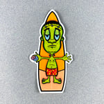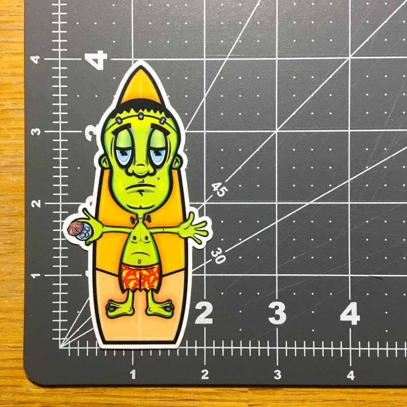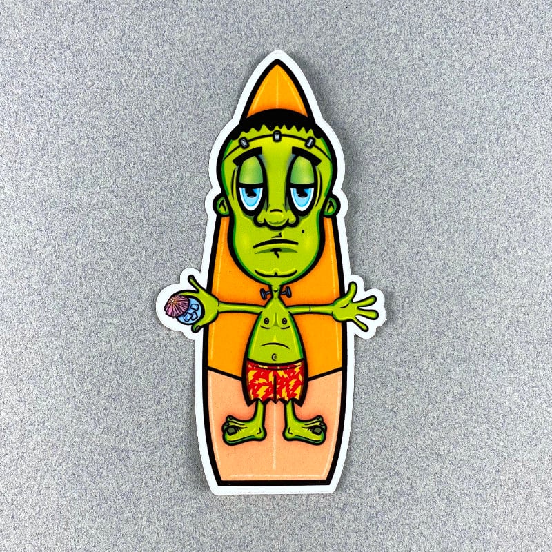 Frankenstein is on permanent vacation with his tropical drink in hand, basking in the golden sun, chilling out on his surfboard. Cruise down the road to the beach with this colorful, fun sticker slapped on your car. Or you can be hanging out with this sweet sticker slapped on your cooler! Chill out and be a bum in the sun, with Frankie Frankenstein and his chill vibes!